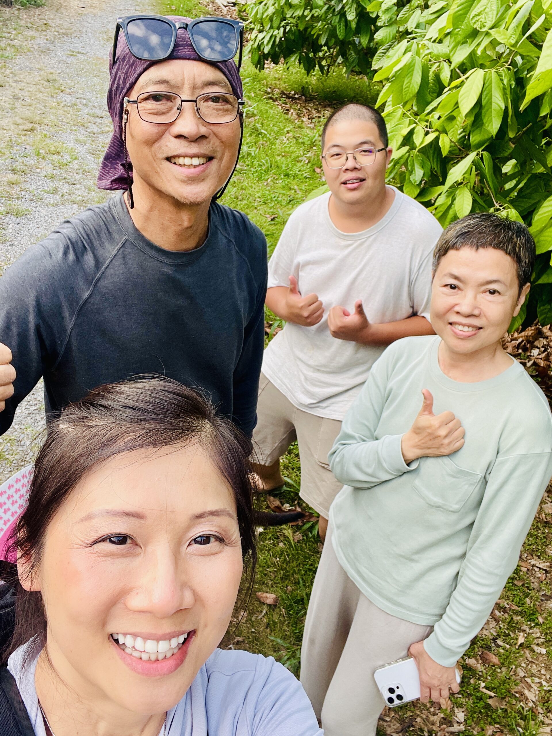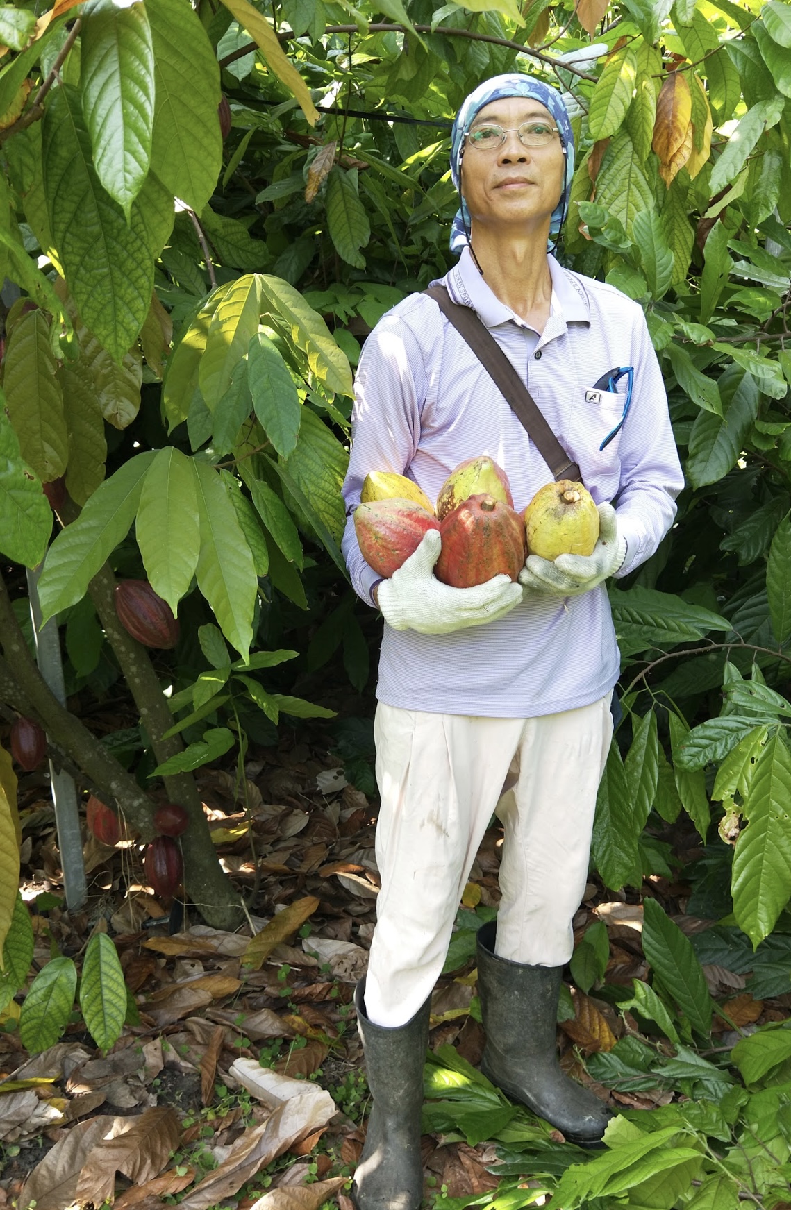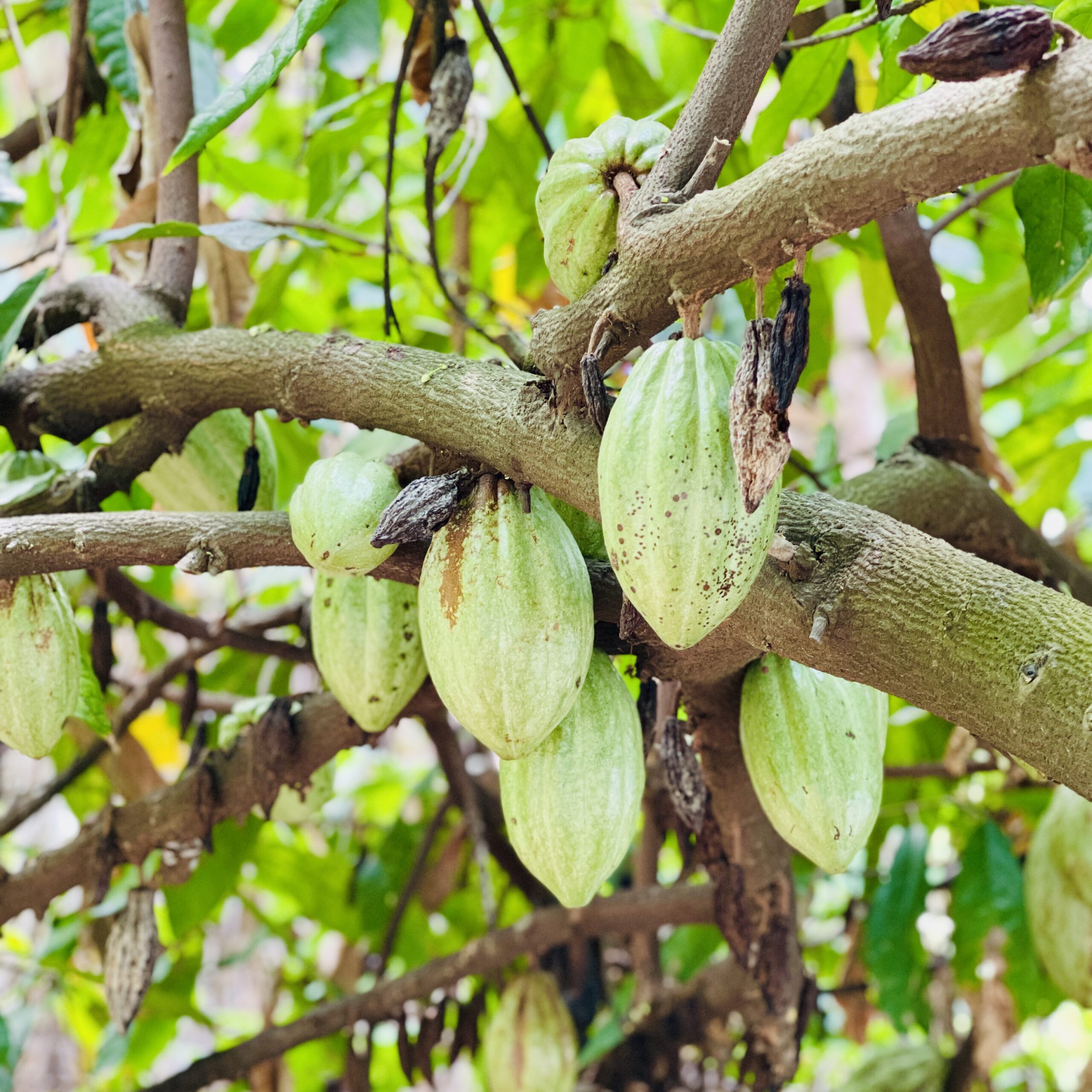 It took Olivia four hours of combined bus and train rides, followed by a half-hour walk to finally catch her first glimpse of Meya Farm’s cacao trees. Surrounded by coconut palms and banana trees, these trees contribute to the land’s rich biodiversity. A fish pond on the farm, part of an aquaponics system, helps the cacao trees thrive naturally.