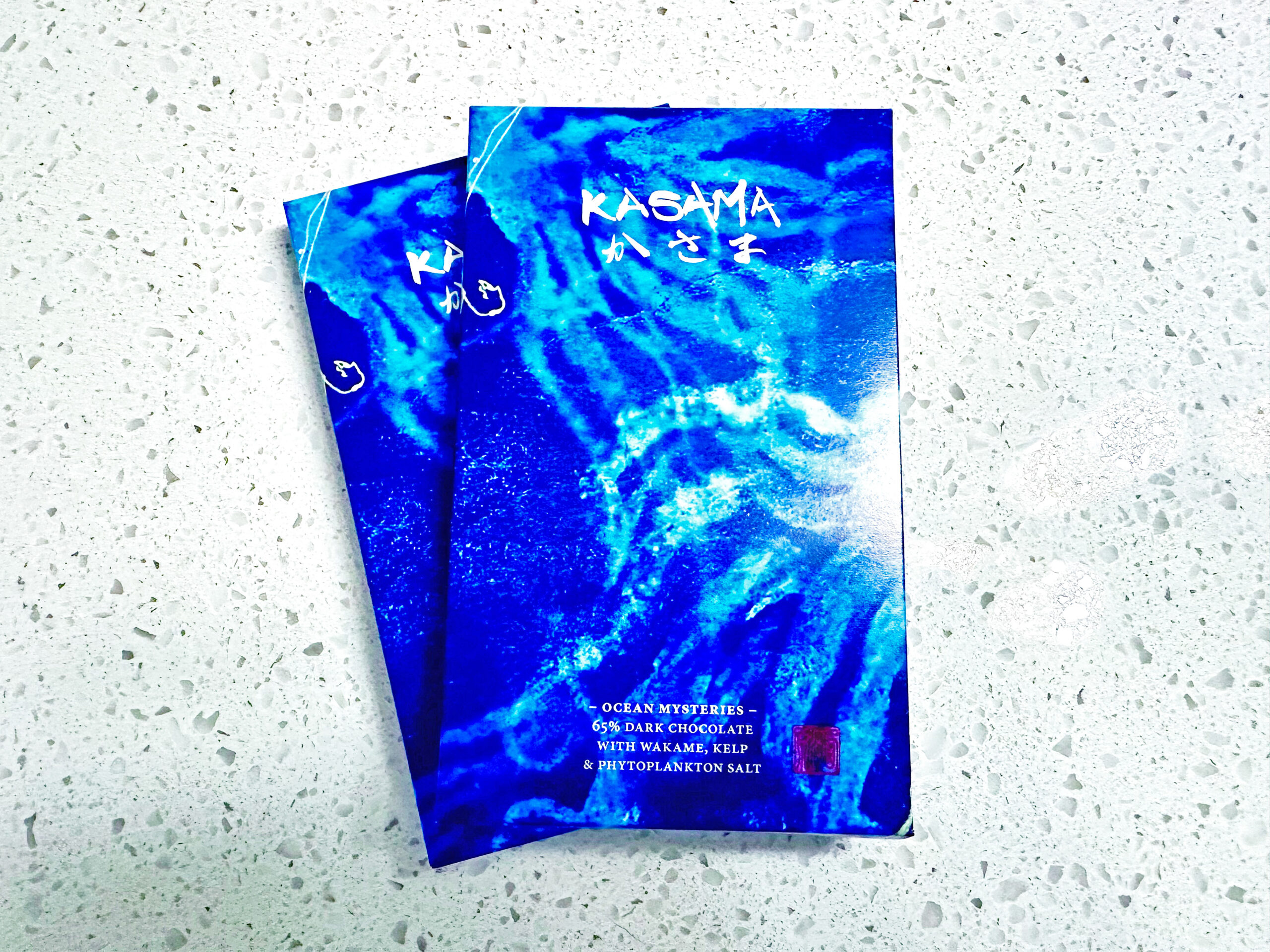 This limited release, 65% dark chocolate bar was created in collaboration with Vancouver-based, international artist Paula Nishikawara in celebration of the mysterious beauty of our oceans. The cacao was slowly stone-ground with giant kelp and wakame sourced from the pacific waters in Haida Gwaii BC imbuing the chocolate with a silky mouthfeel and rich umami flavour. Locally-sourced Phytoplankton salt crystals, from Mayne Island, are sprinkled on the back, shimmering on the surface of a dark chocolate sea.
