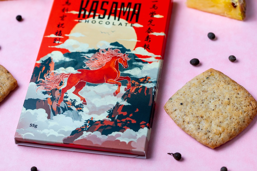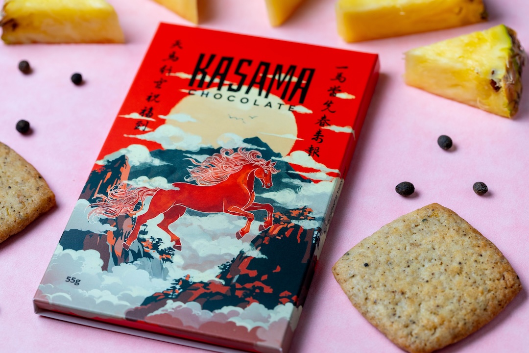 In celebration of the Year of the Horse, we collaborated with Olivia from YI SHI Cacao Collective to bring you this special chocolate bar made with pineapple biscuits and Taiwanese Maqaw pepper. Crunchy pieces of Pineapple biscuit, crafted with Olivia’s house-made pineapple jam, are sprinkled into this 55% dark milk chocolate made with cacao from Tupi, in the southern Philippines.